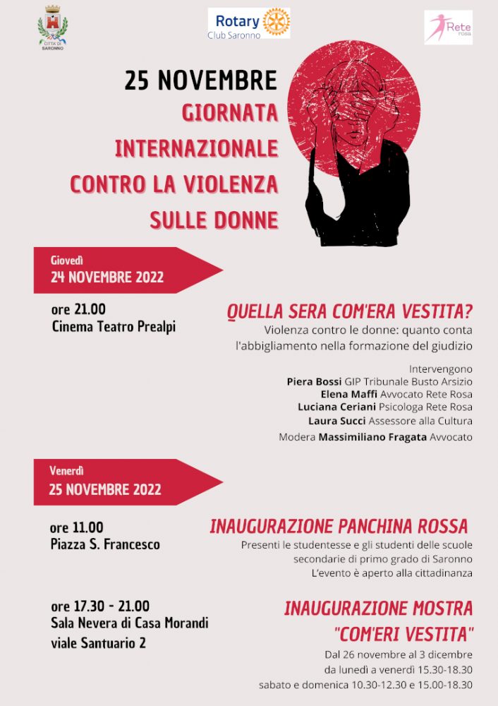 Le iniziative organizzate da Rete Rosa con il Comune di Saronno e il Rotary Club Saronno in occasione della Giornata Internazionale contro la violenza sulle donne si aprono con la conferenza Quella sera com’era vestita? Un approfondimento sugli stereotipi, in particolare quelli legati all’abbigliamento, che troppo spesso colpevolizzano chi subisce violenza. All’incontro, in calendario il 24 novembre alle ore 21:00 presso il Cinema Teatro Prealpi di Saronno, intervengono: Laura Succi – Vicesindaco e Assessore Cultura, Pari Opportunità e Marketing territoriale del Comune di Saronno, Piera Bossi – GIP Tribunale Busto Arsizio, Elena Maffi – Avvocato Rete Rosa, Luciana Ceriani –  Psicologa Rete Rosa, , modera Massimiliano Fragata – Avvocato.