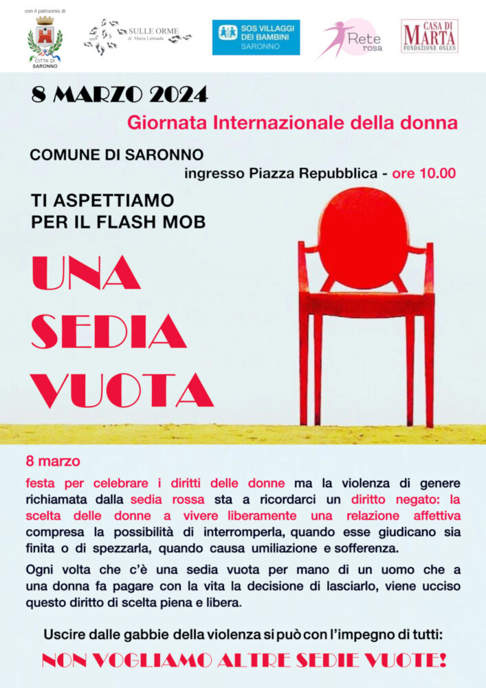 L’8 marzo 2024 nell’atrio del Comune di Saronno si svolgerà l’iniziativa UNA SEDIA VUOTA, un flash mob promosso dall’Associazione “Sulle orme di Maria Lattuada” in collaborazione con il Villaggio SOS di Saronno, la Fondazione Casa di Marta, la Fondazione Maria Lattuada Onlus e l’Associazione Rete Rosa ODV, con il patrocinio dell’Assessorato alla Cultura e Pari Opportunità del Comune di Saronno.